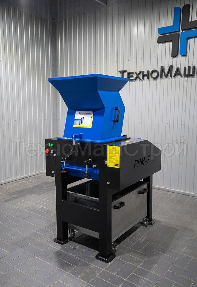 Машина для попереднього подрібнення великих кісток ППМ-7 призначена для ефективного. подрібнення зокрема великих кісток і голів. Завантаження сировини здійснюється через бункер, далі шматки проходять між обертовими шестернями, де подрібнюються і транспортуються до місця призначення.